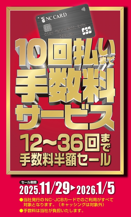 2025年11月29日より2026年1月5日まで、「10回払い手数料サービスセール(12~36回払いまでは手数料半額)」を開催致します。